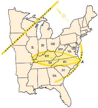 About 300 to 310 million years ago, during the Middle Pennsylvanian epoch when vast peat swamps were forming in southern West Virginia, a similar but much larger volcanic explosion occurred along what is now the east coast of the United States. The prehistoric eruption generated huge quantities of volcanic ash which fell on southern West Virginia and several bordering states (Figure 1). As the ash fell, the environment must have been smelly, gritty, and thoroughly unpleasant for any primitive land creatures such as the amphibians living at that time. (For an idea of what the State's environment was like during the Pennsylvanian, see the articles "300 Million Year Old Footprints Found in Tucker County" in the 1982 issue of Mountain State Geology, and "Fossil Footprints Unearthed in Eastern Panhandle" in the 1988 issue.)