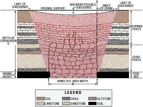 Figure 8. Generalized cross section of subsidence. The area on the surface affected by subsidence is usually wider than the area mined out below. The angle of draw is formed by a line from the edge of the mined area straight up to the surface (A-B), and a line from the edge of the mined area to the edge of the surface subsidence (A-C). The angle of draw does not exceed 45 degrees. In the northern Appalachian Basin, maximum possible subsidence (S) seldom exceeds 65% of the mining height (H). (For example, if 100 inches of coal were mined, the maximum surface subsidence would be 65 inches.) In general, for any given mined out area width (W), greater depth of overburden (D) results in less subsidence than the maximum possible subsidence (S). However, even small movements can damage a structure. (Adapted from S. Tandanand and L. R. Powell, 1982, Assessment of Subsidence Data from the Northern Appalachian Basin for Subsidence Prediction: U. S. Bureau of Mines Report of Investigations 8630. (Illustration by Ray Strawser)