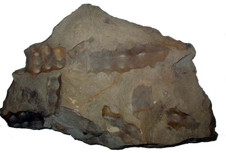The Glass Sponge gets its name from its skeleton made of six-pointed siliceous (glass-like) spicules. The Hydnoceras fossils shown in these photos are one of several thousand species of fossils belonging to the Phylum Porifera (sponges). Sponges are one of the most primitive animals, and as such, lack many of the typical features of animals including nerves and locomotion. Sponges have a feeding system unique among animals. Poriferans don't have mouths; instead, they have tiny pores in their outer walls through which water is drawn. Cells in the sponge walls filter nutrients from the water as the water is pumped through the body and out other larger openings.